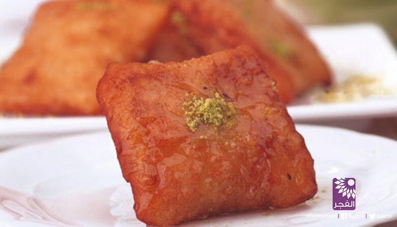 – ترفع المربعات من الزيت بواسطة ملعقة ذات ثقوب، ويسكب فوقها العسل أو القطر، وتقدم فاترة.