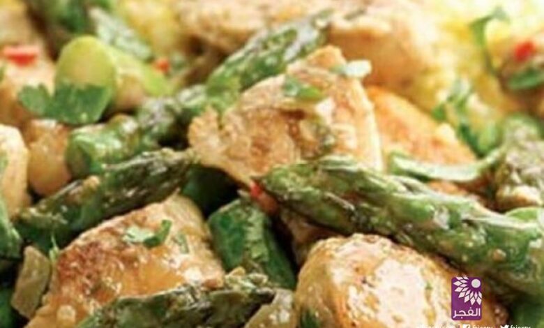 تضاف قطع الهليون وتطبخ لمدة 1-2 دقيقة أو حتى يصبح الهليون طريا والدجاج ناضجا تماما.