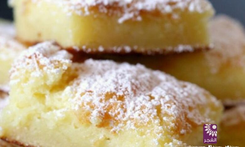 تترك الكعكة لتبرد، ثم تقطع الى مربعات وترش بالسكر البودرة.