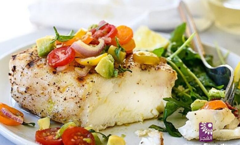 الهلبوت المشوي مع صلصة الطماطم الأفوكادو