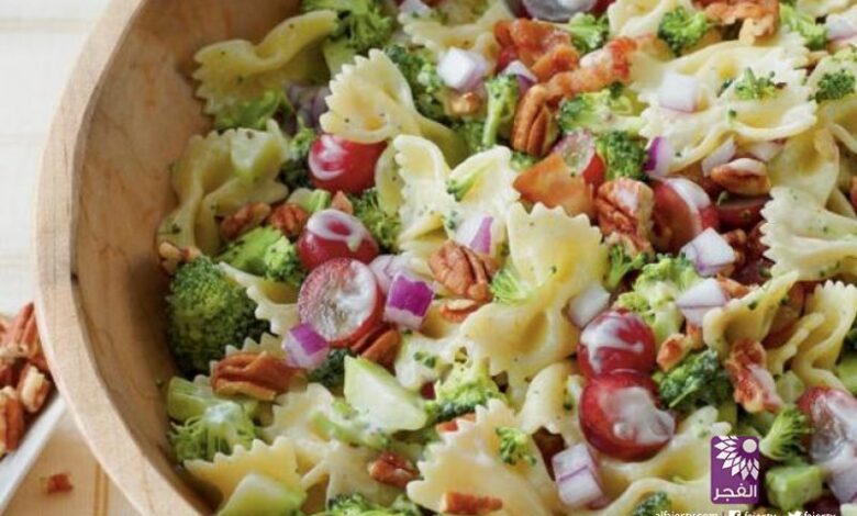 يخفق المايونيز والمكونات 4 المتبقية في وعاء كبير. تضاف زهرات البروكلي، والمعكرونة المطبوخة الساخنة، والعنب، ويحرك المزيج جيدا. يغطى ويوضع في البراد لمدة 3 ساعات. يضاف الجوز واللحم المقدد قبل التقديم مباشرة.