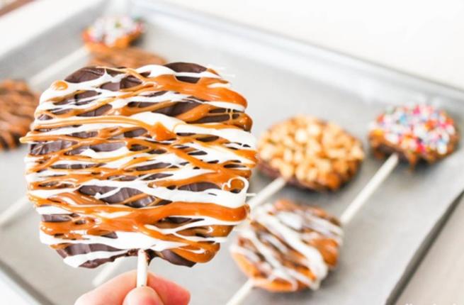 تغمس الشرائح في وعاء به شوكولاتة أو كراميل حسب الرغبة، ويوضع عود على كل شريحة ويثبت بالشوكولاتة الداكنة.