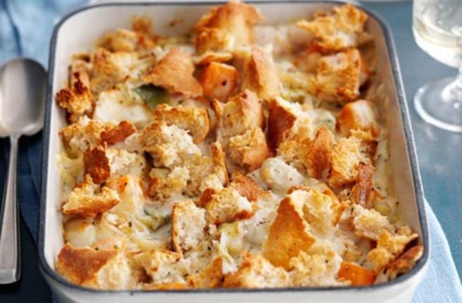 – تصب في طبق تقديم عازل للحرارة وتضاف قطع الخبز له. يطبخ لمدة 30 دقيقة حتى يصبح الخبز ذهبيًا.