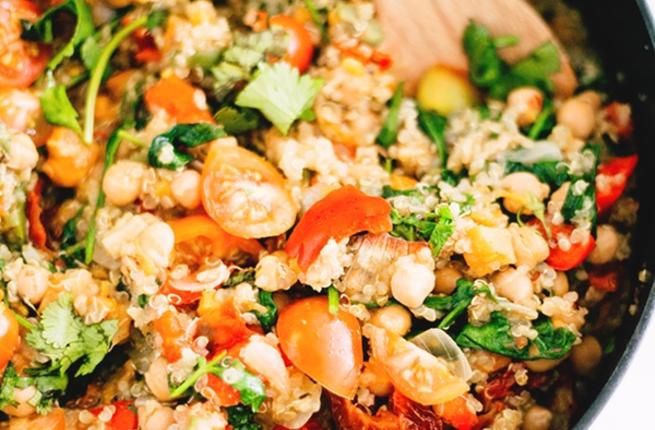 تضاف الكينوا إلى الوعاء وتحرك جيدًا. يصب فوقها مرق الخضار والسكر وتقلب لمدة 10 ثواني. يترك ليغلي، ثم يغطى ويترك على نار خفيفة مدة 20 – 25 دقيقة حتى يتم امتصاص السائل.