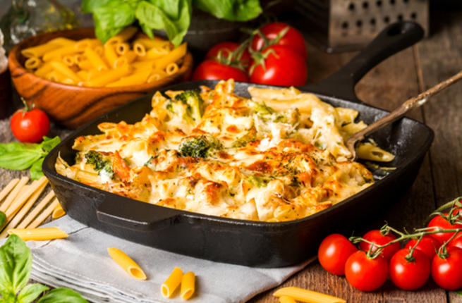 – يسخن الفرن على درجة حرارة 180 مئوية وتدهن الصينية بالزيت أو السمن، ويوضع فيها خليط المكرونة والخضروات ثم يوضع البشاميل فوق المكرونة، ويرش فوقه الجبنة المبشورة ثم يدخل الفرن لمدة من 30 إلى 40 دقيقة.