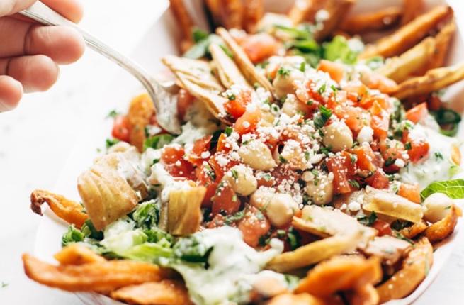 التجميع: توضع طبقات من البطاطس الحلوة والخبز المقرمش وصلصة الحمص والخس والجبن واللبن وتقدم في طبق كبير للمشاركة.
