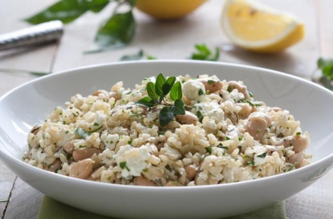 في وعاء يخلط زيت الزيتون والليمون والثوم والاعشاب. يضاف على الأرز. يضاف الفاصولياء بيضاء والفيتا ويخلط جيدا.