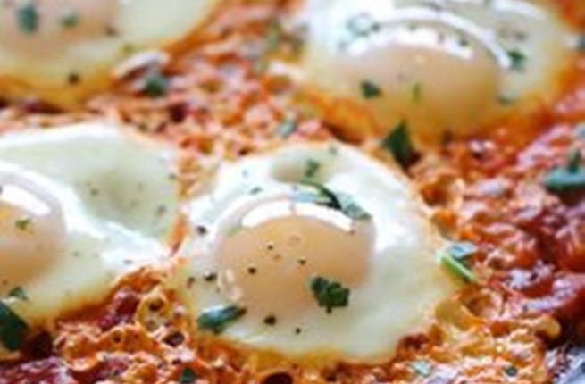 تخفض الحرارة إلى متوسطة- منخفضة، يضاف البيض بعناية وتتبل بالملح والفلفل وتغطى. تطبخ حتى ينضج الجزء العلوي من البيض، حوالي 4 إلى 5 دقائق أو حسب رغبتك. يرش بالبقدونس الطازج المفروم أو الثوم المعمر.