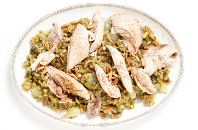 – وأخيراً ضعي الفريكة في طبق التقديم، وضعي فوقها الدجاج المشوي والمحمر، والمكسرات المشكلة المقلية وصجتين وعافية.