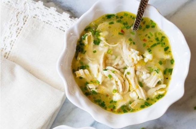 شوربة الدجاج بالليمون على الطريقة اليونانية بجبن الفتا والنكهات المتوسطية الشهية.