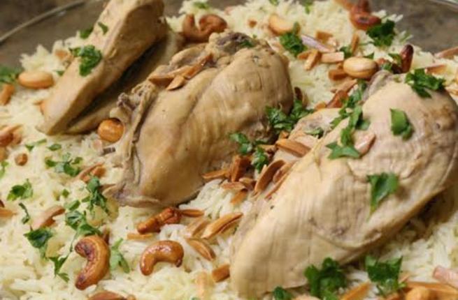 5. ثم توضع طبقة من الأرز البسمتي الأبيض المفلفل والجاهز.