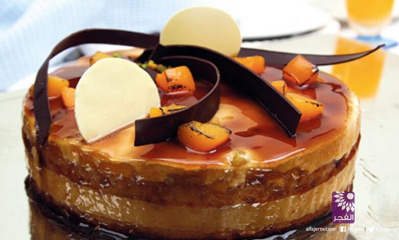 – يخرج طبق الكاسترد من الثلاجة، ويدهن بصلصة الكاراميل، ثم يزين بمكعبات الدراق المحتفظ بها جانباً وشرائح الشوكولا والفستق الحلبي المطحون.