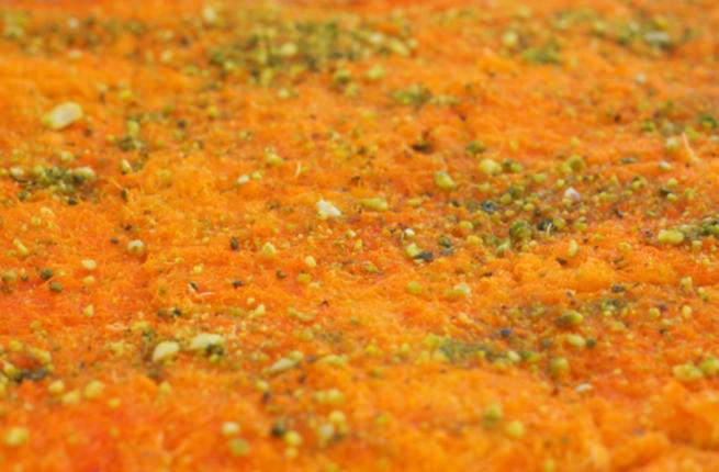 -وأخيراً نرش المكسرات على سطح الكنافة وندخل الصينية إلى الفرن بحرارة متوسطة إلى أن تذوب الجبنة لمدة 10 دقائق تقريبا و نخرج الصينية ونضع الشربات الساخن فوقها وتقدم.