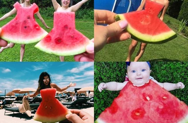 اجتاحت وسائل التواصل الاجتماعي منذ فترة موضة ظريفة جدا حيث يتم من خلالها تقطيع البطيخ إلى اشكال تشبه الفساتين أو التنانير وتركيبها مع صور لأشخاص بحيث تبدو وكأنها فساتين حقيقية.