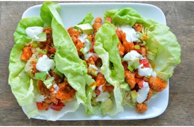 قطع الدجاج المتبلة بالصلصة الحارة والمقدمة في شرائح الخس المقرمشة.