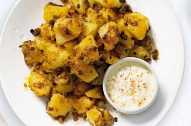 تطهى البطاطا لمدة 10 دقائق حتى تصبح طرية، ثم تقدم مع لبن الزبادي وترش بالفلفل الحار.