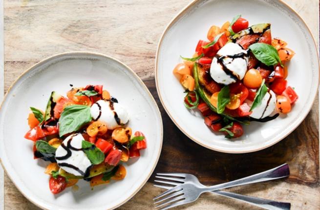 توضع مثلثات البطيخ على كل طبق، ثم تضاف قطع الطماطم والموزاريلا وأوراق الريحان. ترش بالملح والفلفل وخل البلسميك ثم تقدم.