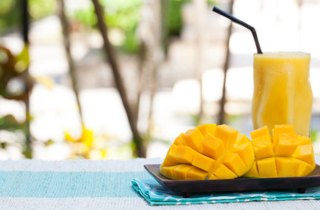 كما يمكن ضرب المانجو في الخلاط مع القليل من الماء دون إضافة سكر، حيث يمكن تناولها كعصير في أي وقت.