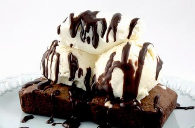 – ثم يسخن الفرن على درجة حرارة 180 مئوية ويصب الخليط في صينية بها ورقة زبدة ويدخل الفرن لمدة من 25 إلى 30 دقيقة بعدها تخرج من الفرن، وتترك لتبرد وتقطع، ويوضع فوقها آيس كريم الفانيليا وصوص الكراميل وتقدم.