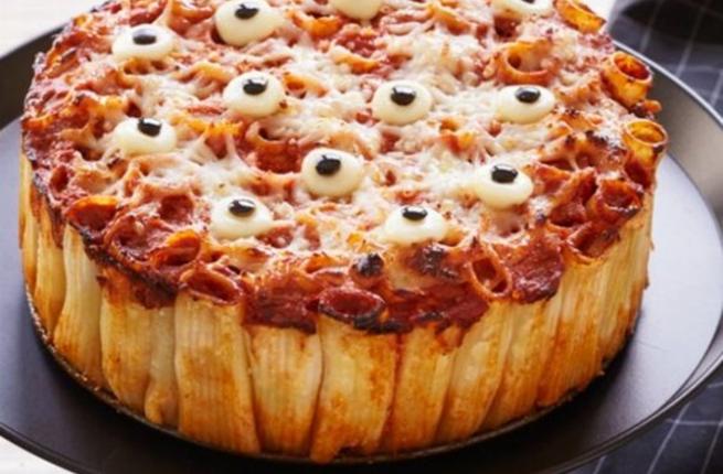 تخبز لمدة 15 دقيقة أخرى ثم تخرج وتوضع حلقات الجبن فوق الباستا ثم توضع في الفرن حتى تذوب قليلا.