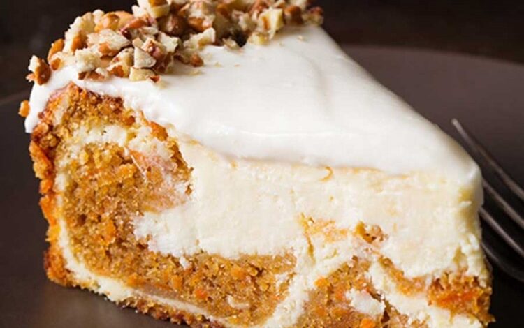 9. ضعي باقي كمية خليط كيك الجزر فوق خليط الجبن ثم باقي كمية خليط الجبن وأدخلي الصينية للفرن لمدة 60 دقيقة حتى ينضج الكيك ثم اتركي الكيك ليبرد لمدة ساعة على الأقل وغطي القالب بورق القصدير وأدخليه الثلاجة لمدة 6 ساعات أو طوال الليل.