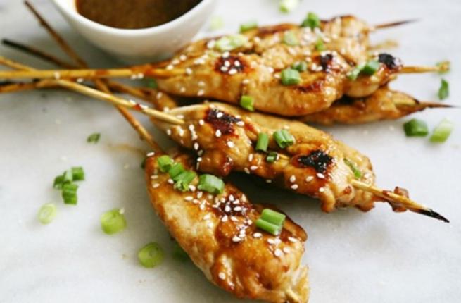 تشك شرائح الدجاج على الاسياخ.
