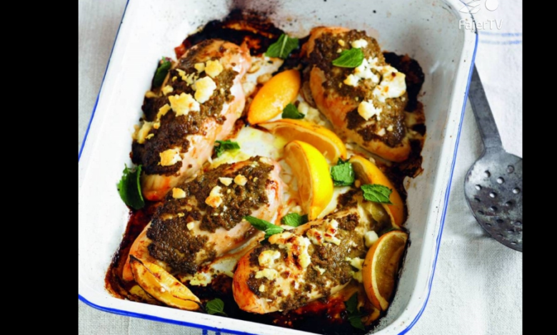 تخرج الصينية من الفرن وتفتت جبنة الفيتا فوق الدجاج وتعاد الصينية إلى الفرن لمدة 5 دقائق إضافية. مباشرة قبل التقديم، توزع أوراق النعناع المفتتة للحصول على نكهة متوسطية لذيذة.