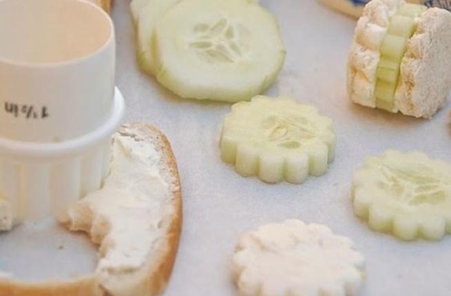 توضع شرائح الخيار فوق كل شرائح الخبز وتغطى وتوضع على طبق التقديم.