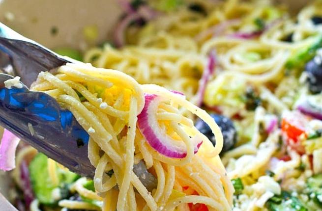 سلطة الإسباجيتى اليونانية مع صلصة ديجون