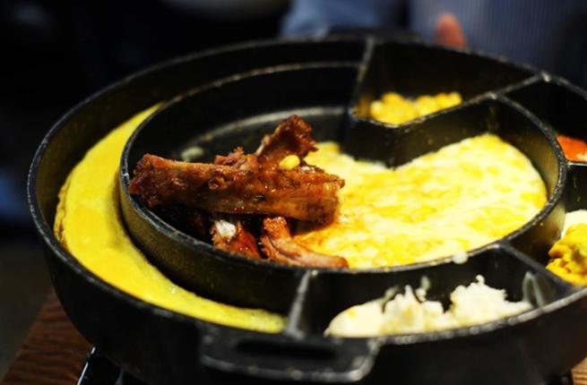 ترفع الضلوع وتترك جانباً. في نفس المقلاة، يضاف الجبن والذرة ويطهى حتى يذوب الجبن.