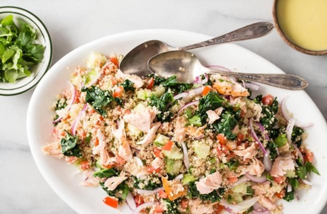 يعتبر السلمون من الاسماك الصحية الغنية بالاحماض الدهنية والعديد من الفوائد الصحية، كذلك حبوب الكينوا تعد من البقوليات المغذية والمشبعة والمفيدةالمكونات: