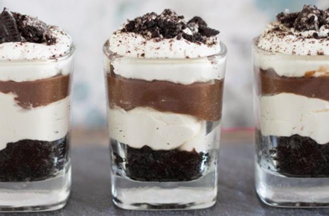 نحضر كاسات من البراد ونضع في قاع الكاسات ملعقة من الكريما ثم نضيف ملعقة فوق الكريمة من بسويكت الأوريو.