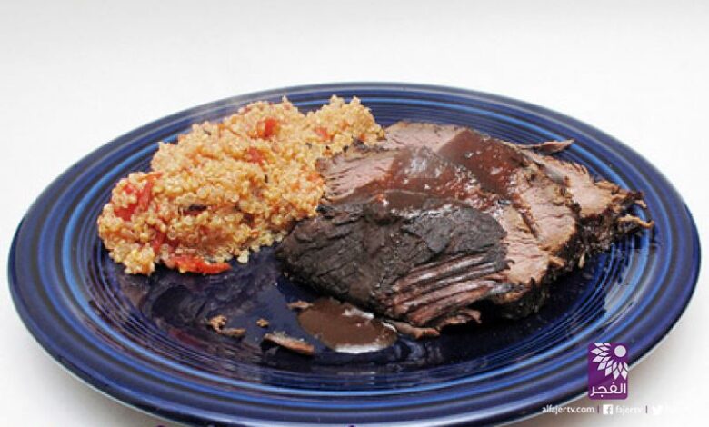 5. تقطّع كلّ شريحة لحم إلى شرائح رفيعة، وتوضع فوق البطاطا المهروسة، ثمّ يُسكب خلّ البلسميك مع الكرّاث على شرائح الستيك، ويُزيّن بالشّبث.
