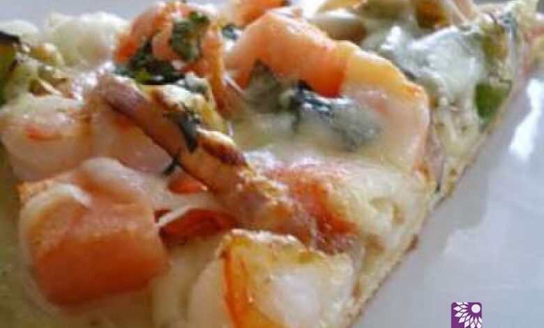 4- تضاف صلصة البيتزا فوق العجينة ثم يضاف الجمبري ثم يضاف الفلفل الأحمر والأخضر والطماطم والبصل وترش الجبنة الموتزاريلا والشيدر من على السطح وتقطع البيتزا على شكل مثلثاث.