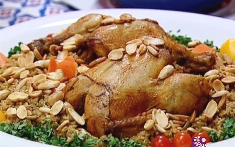 8. أسكبي الفريك في طبق تقديم، وزعي الدجاج على الفريك وزيني بالمكسرات المقلية.
