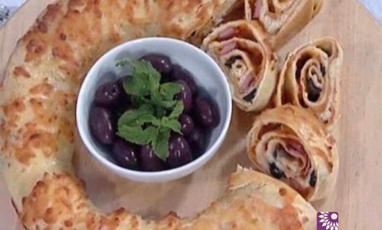 7. ضعي اللفافة على الصينية، الصقي طرفي اللفافة مع بعضهما البعض ليصبح لديك حلقة مفرغة من الوسط.