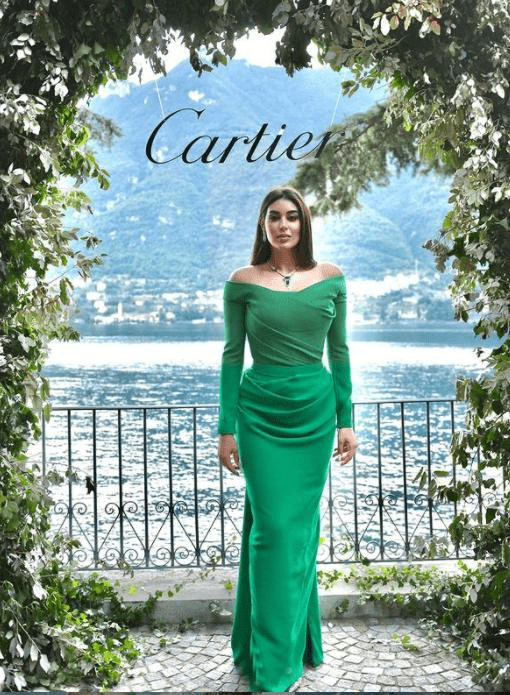 أما الإطلالة الأجمل فهي تتمثل بإطلالتها في حفل كارتييه بفستان من الكريب الحريري الأخضر الزمردي وهو يحمل توقيع المبدع العالمي اللبناني نيكولا جبران. وقد تزينت النجمة بمجوهرات ماسية من الدار.
