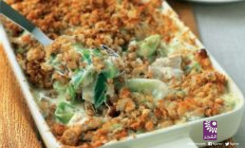 3- تذوب الزبدة في مقلاة وحين تصبح مثل الرغوة، يضاف الكعك المطحون ويقلى على نار متوسطة لمدة 2 إلى 3 دقائق حتى يصبح الكعك المطحون هشاً. يسكب هذا الكعك المطحون فوق الدجاج والكراث. يخبز الطبق في الفرن لمدة 15 دقيقة تقريباً حتى يشقرّ الكعك المطحون.