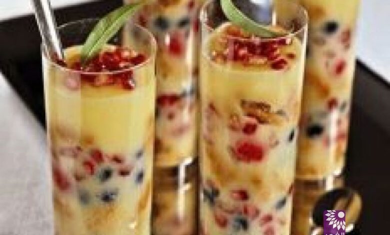 – نضع طبقة من البسكويت في الصحون أو الأكواب ثم طبقة من التوت والتوت البري ثم الرمان فالبسكويت.