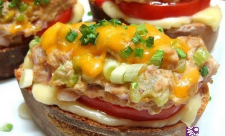 افتحي السندويشات و حمصيها. ادهني ملعقة صغيرة من الخردل على جهة داخلية واحدة من السندويش ثم اضيفي نصف خليط التونا فوق الخردل. غطيه بالطماطم و أضيفي الجبن .