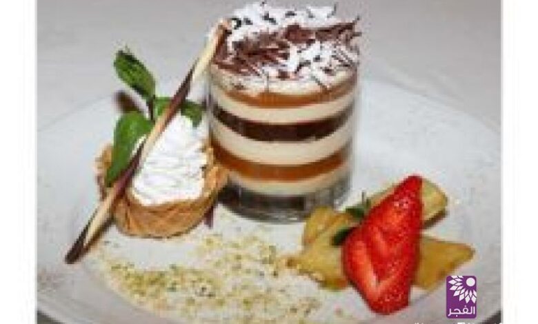 4- لدى التقديم: تسكب كميّات متقاربة من كل نوع خليط في الكوب الواحد لتكوين طبقات. وتبشر الشوكولاته الداكنة وتنثر بودرة السكر على الوجه، مع تزيين جانب الطبق بالكريما وقطع الفاكهة والفستق المبشور.