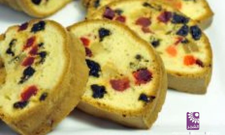 – يُصب نصف الخليط في القالب المُعد ثم يُضاف الحشو ( اللوز والفواكه الجافة).