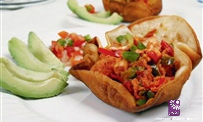 يحمى كوب من الزيت النباتي في قدر صغيرة. يوضع رغيف تورتيلا في الزيت ويضغط على وسطه بكوب زجاجي طويل. يضغط على الكوب جيداً ويتابع قلي رغيف التورتيلا حتى يشقرّ ويتخذ شكل طبق (أنظري إلى الصورة).