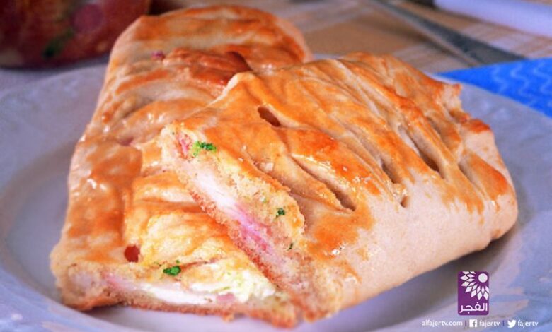يسكب مزيج لحم التونة في وسط العجينة، وتلف أشرطة العجين الجانبية فوق المزيج على نحو متشابك في شكل ضفائر.