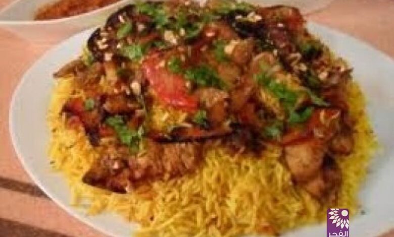 تصف طبقة من الرز وطبقة من البازنجان وطبقة من الرز ويزين الوجه بطبقة من اللحمة والمكسرات ويقدم مع اللبن الرائب والسلطة والشوربة