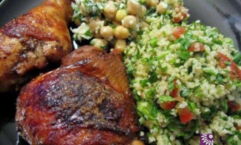 9- تُخرج قطــع الدجــاج من الفـرن، وترص فى صحـون التقـديــم مع الخُبز والسلــطات العـربيــة