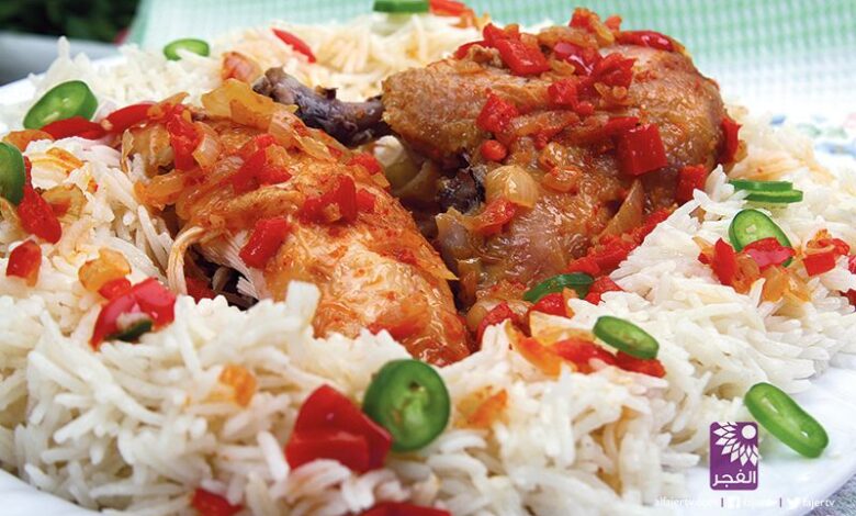 يسكب الدجاج في وسط طبق التقديم ويوزع حوله الأرز. يزين الطبق بالفليفلة الحمراء المفرومة ناعماً ويقدم.