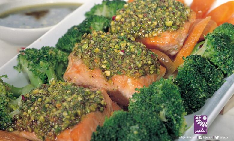 تدهن شرائح السلمون بزيت الزيتون. ثم تبسط حشوة الفستق فوق الشرائح. ويسكب المزيد من زيت الزيتون فوق كل شريحة.