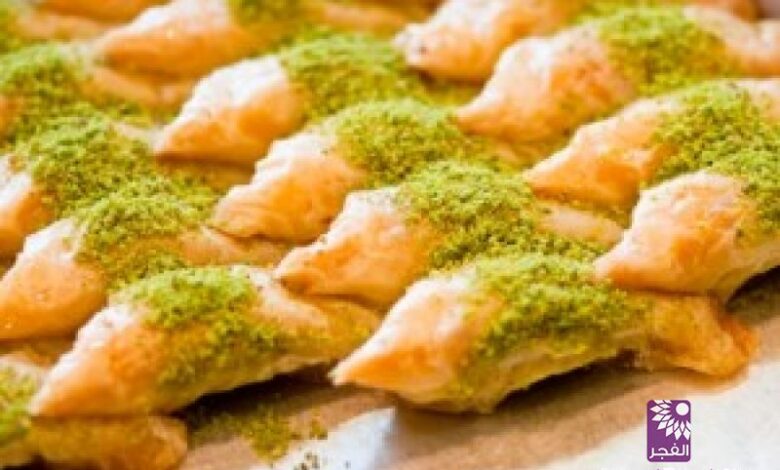 – يعاد رص الرقائق فوق الفستق مع مسح كل منها بالزبدة ثم تقسم على شكل معين بسكين حادة.
