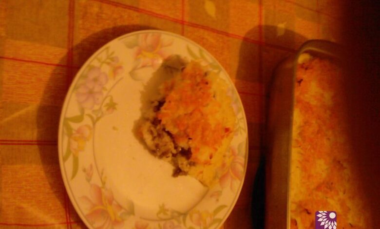 نضع الارز يغلي في الماء لمدة 15 د ثم نصفيه في مقلاة نضع البصل المفروم مع قليل من الزيت و الملح و الفلفل الاسود و قليل من الزنجبيل ثم نضيف اللحم المفروم و نضعه لينضج في وعاء اخر نضع قليل من الزيت و الثوم ثم نضع فوقه الجزر المفروم و نتبله بقليل من الملح و الفلفل الاسود و الزنجبيل و ندعه لينضج في صينية فرن متوسطة الحجم مدهونة بالزبدة نضع طبقة من الارز ثم حشوة اللحم المفروم ثم نغطيه بطبقة اخرى من الارز و نضع فوقه الجزر المطهو مسبقا ندخل الصينية للفرن ليحمر وجه الطبق نخرجه و نزين بالبقدونس .
